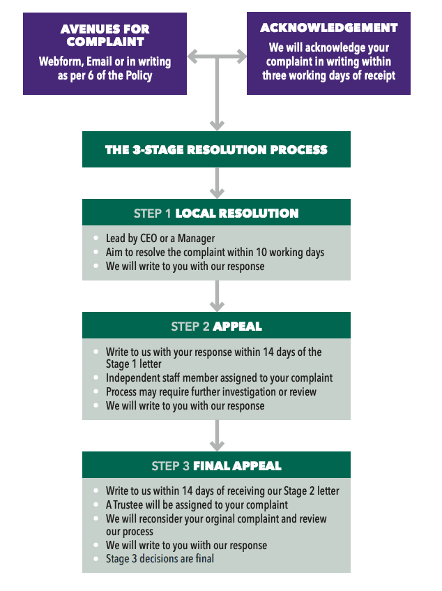 Through the implementation of this policy and procedure, we will ensure there is a fair, clear and consistent process which sets out three stages for considering complaints. This includes, as far as possible, a consistent contact person who will update you throughout the process.
